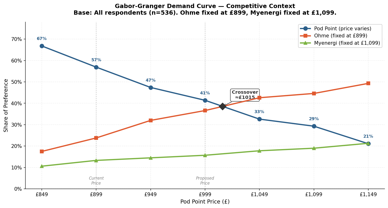 When competitors are included, the output shifts from purchase intent to share of preference. Each line tracks the share of respondents who would choose that brand at each price point. As Pod Point’s price increases, its demand drops while Ohme (the cheaper competitor) gains share. The crossover point (≈£1,015) marks where Pod Point loses its preference advantage.