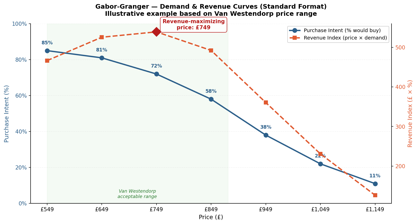 The standard Gabor-Granger output when the product is evaluated alone. The blue demand curve shows how purchase intent drops as price increases. The revenue curve (price × demand) captures the trade-off: higher prices bring more revenue per unit but fewer buyers. The peak of the revenue curve — here at £749 — is the price that maximizes total revenue.