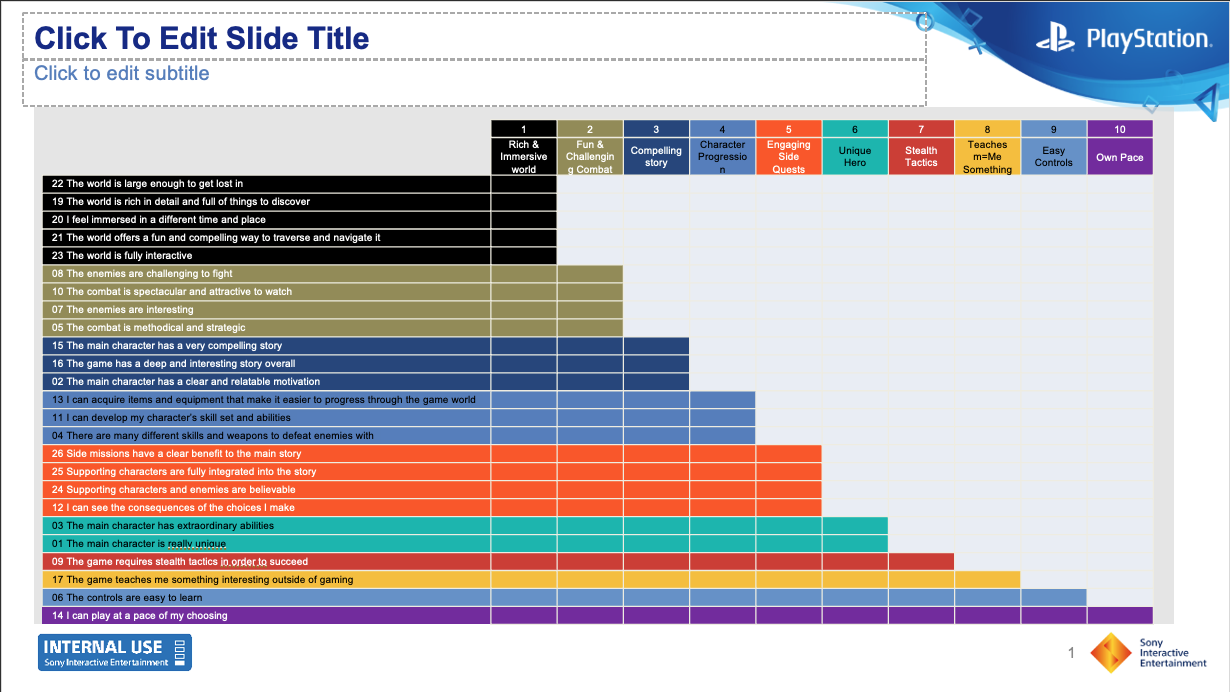 - Component 2 — Fun & Challenging Combat: items about enemy difficulty, combat aesthetics, and strategic depth